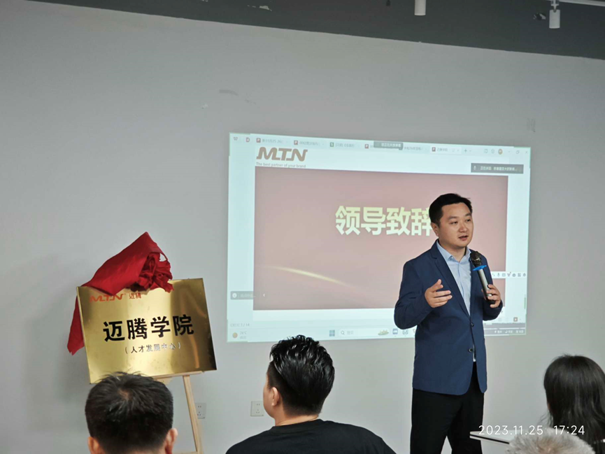 2023年11月25日,邁騰學院(人才發展中心)揭牌儀式在惠州工廠隆重舉行,公司總經理黃總和賀老師共同為邁騰學院(人才發展中心)共同揭幕。