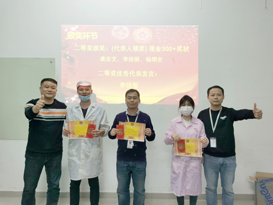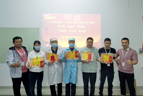 11月份,共收到員工提出186項提案,經各評審小組審核評選,最終角逐出一等獎1名,二等獎3名,三等獎6名,評審小組成員分別為優秀提案改善項目人員頒發榮譽證書、獎金,并合影留念。